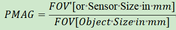系统的放大倍率(PMAG)是像平面的视场(FOV’,传感器成像面尺寸)与物平面的视场(FOV)的比值。