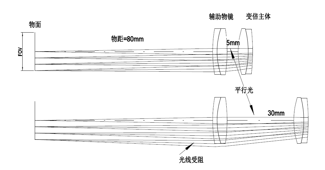 图 2当辅助物镜与变倍主体之间的距离由5mm增大到30mm时,光线被辅助物镜遮挡