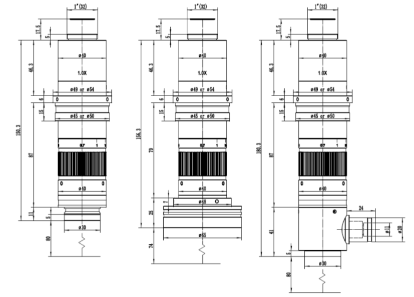 图 7中标注了SZ0745,SZ0745DRL和SZ0745CL的尺寸。其中SZ0745长150.3mm,远远小于市场上绝大部分数码用连续变倍显微物镜的长度。