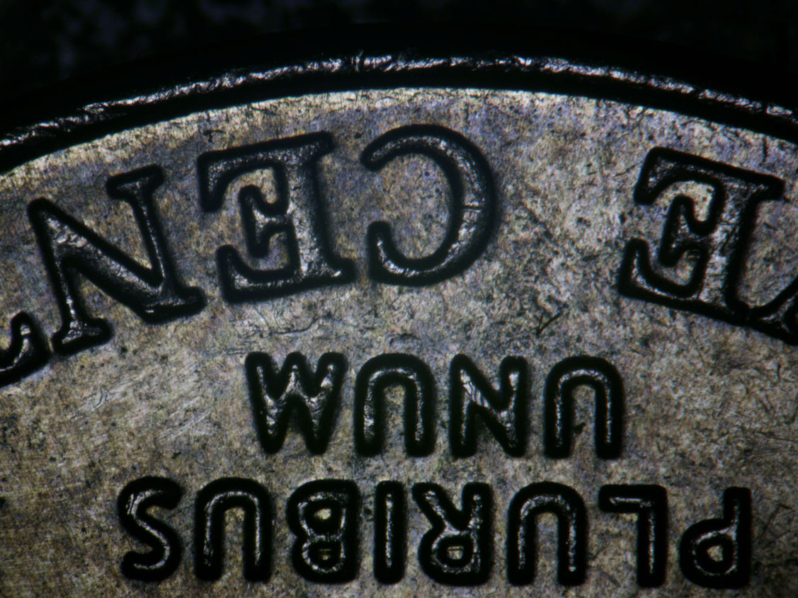 图 18 自左到右,分别是硬币在左)普通环形光源;中)偏振环形光源;右)同轴照明光源照明下的拍摄效果